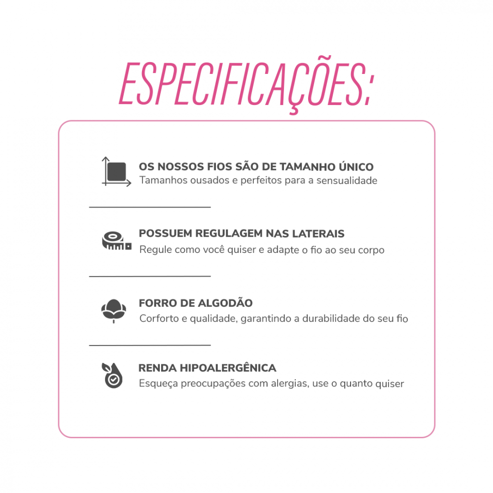 Tem dúvida sobre o tamanho? Fique tranquila que nós temos a solução: Nossas calcinhas são TAMANHO ÚNICO e possuem regulagem nas laterais, podendo ser ajustadas no corpo da forma que você quiser.