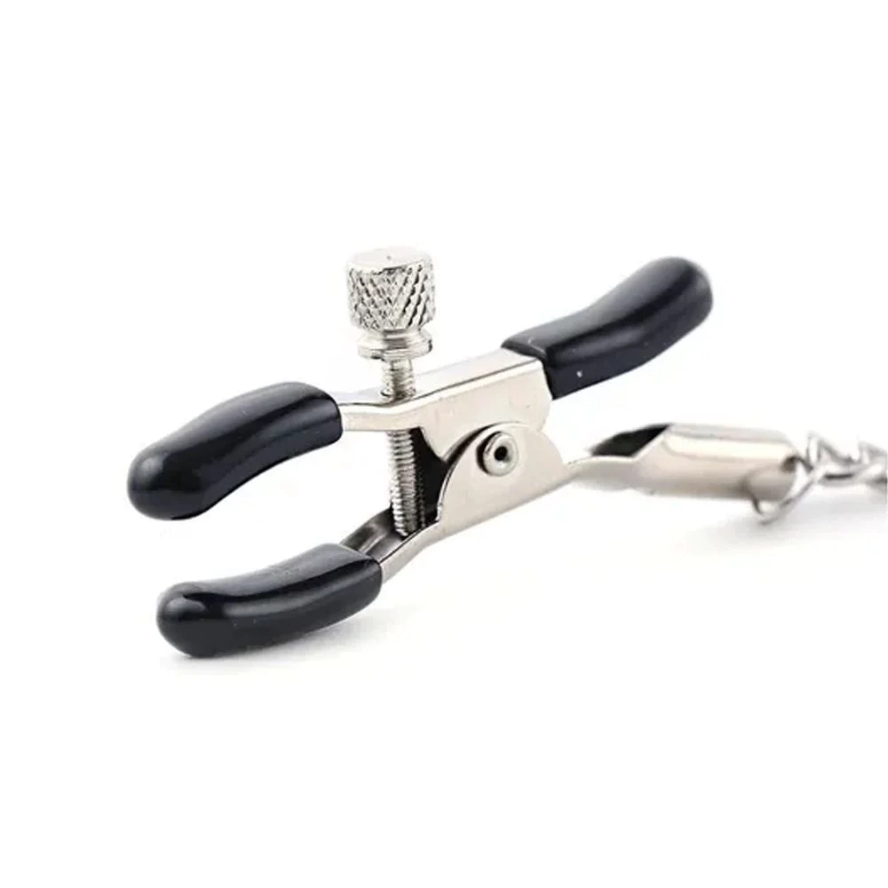 Grampos para os seios em metal com presilhas ajustáveis para diversificar a pressão, possui corrente que interliga os dois grampos.